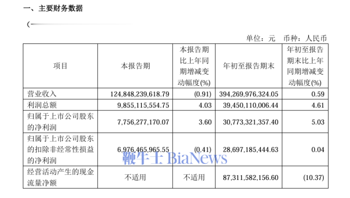 营业收入:前三季度实现3942.70亿元,同比增长0.59%;第三季度单季营业收入1248.48亿元,同比下降0.91%。