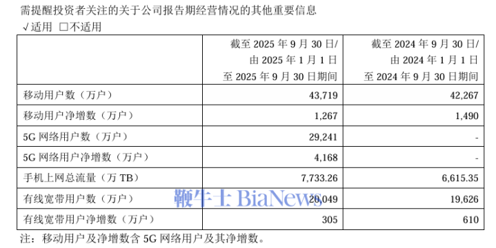 移动用户:前三季度末达4.37亿户,净增1267万户;其中5G用户2.92亿户,净增4168万户,5G用户渗透率66.9%。